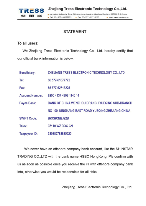 Copyright ©2004 Zhejiang Tress Electronic Technology Co.,Ltd. All Rights Reserved.