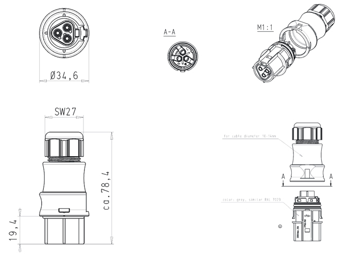 Single-phase power supply and a, 250 v, wire diameter 10-14 mm, three hole, screw connection